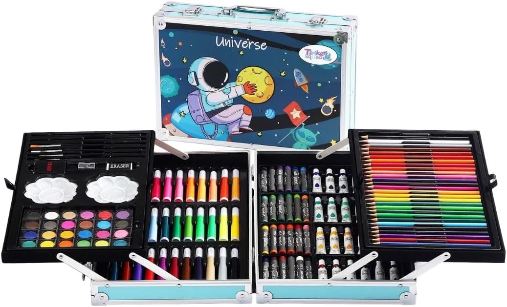 Perfect for ages 4 and up, this all-in-one art set is great for drawing, painting, and crafting at home or on the go. The fold-out trays keep supplies neatly organized, and the rainbow of colors inspires hours of imaginative fun!