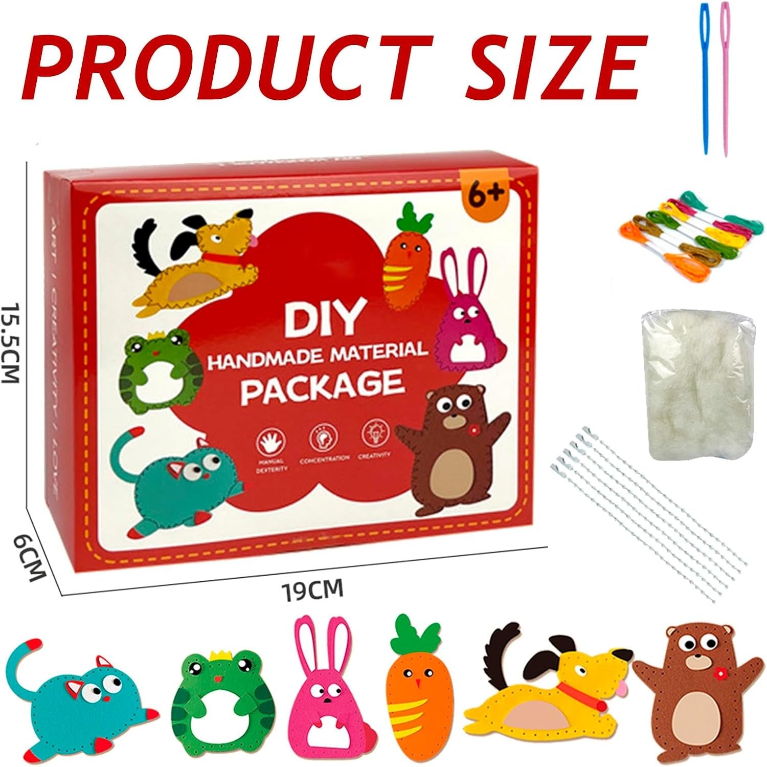 This sewing kit contains everything you need (yes, really everything) so you can get started straight away on these fun craft projects. This 165+ piece set includes 8 pre-cut felt projects, 5 colors of embroidery thread, 10 pairs of craft eyes, plastic and metal sewing needles, 40 straight pins, needle threaders, scissors, stuffing, and easy-to-follow instructions.