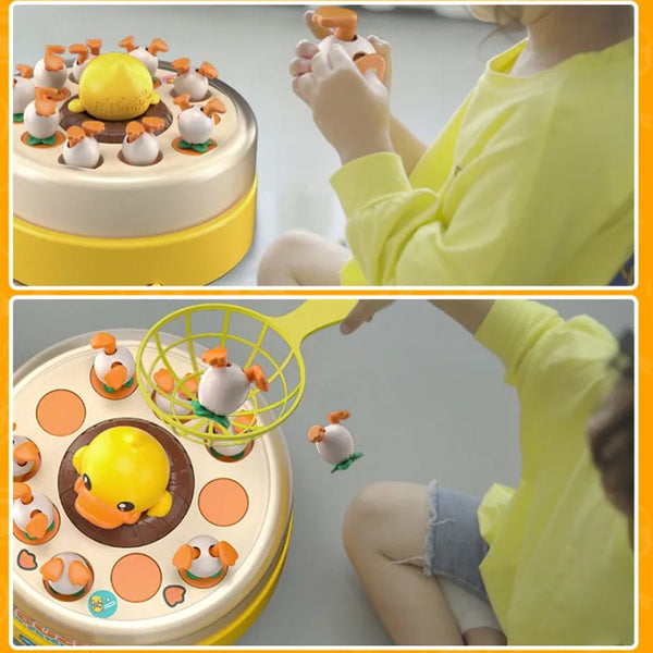 The Electric Bouncing Duck Catching Toy features bouncing ducks that add an element of unpredictability and fun to the game. As the ducks bounce and move around, children must sharpen their hand-eye coordination to successfully catch them. The lively and dynamic nature of the bouncing ducks creates an exhilarating experience for young hunters.